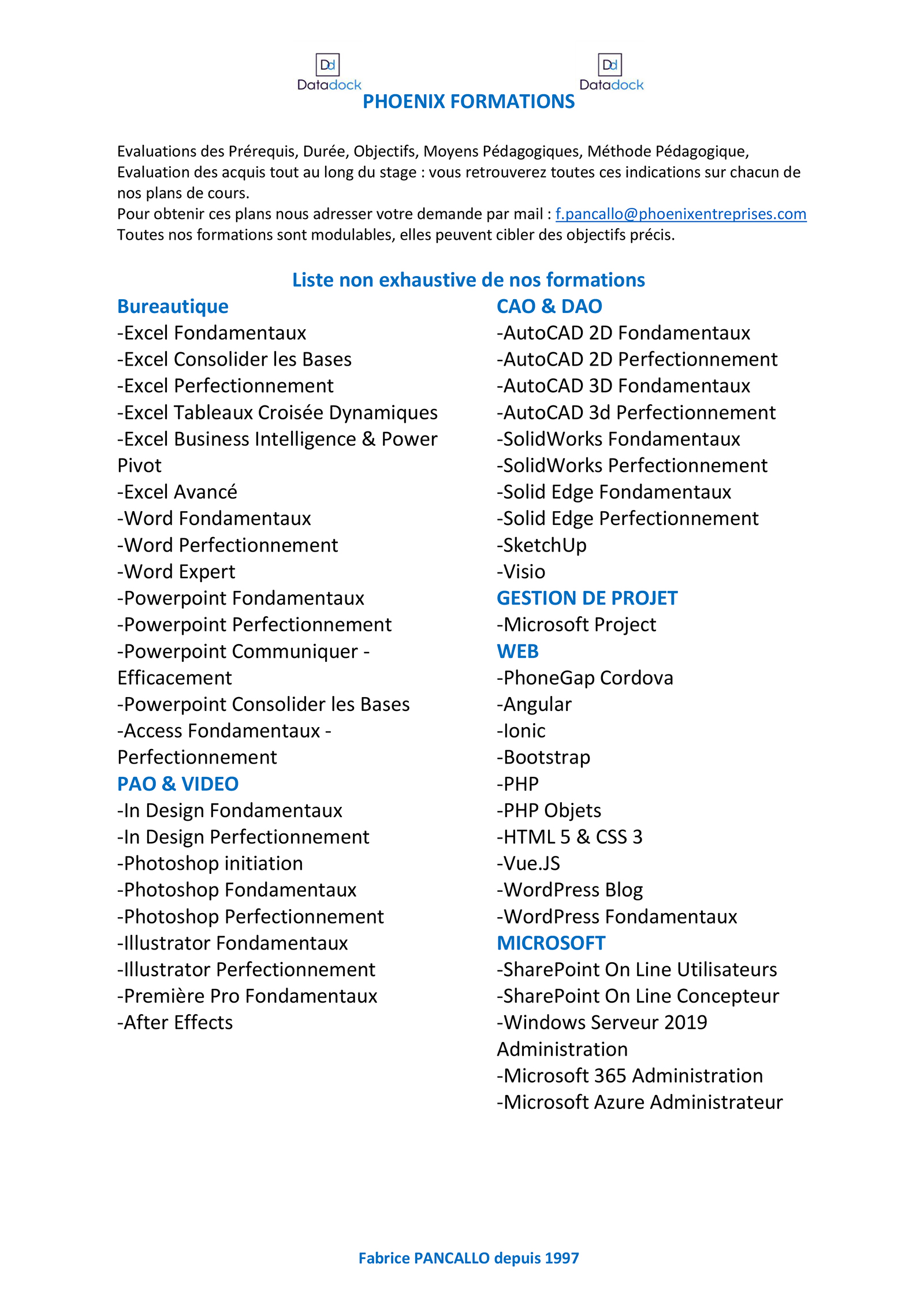 Qui sommes-nous : Avec plus de 20 ans d’expérience dans la formation professionnelle, nous sommes en mesure de vous accompagner dans toutes les étapes du processus Formation. C’est en 1997 que je débute dans le domaine de la formation en Informatique. Tout d’abord sous franchise Américaine pendant trois ans, puis sous l’enseigne d’une PME locale à Nice route de Grenoble employant 15 personnes. PME qui sera vendue en 2011 à un groupe national qui ferme le site de Nice en décembre 2012. Janvier 2013, création de Phoenix Formations. Aujourd’hui Phoenix Formations est présent de Menton à Marseille. Les stages se déroulent en présentiel ou à distance. Uniquement dans les Entreprises (INTRA). Nos formations ne concernent que le domaine de l’Informatique, pour les utilisateurs finaux, les développeurs, les gestionnaires d’infrastructures en entreprises. Plus de 1000 plans de cours sont disponibles et pour obtenir celui qu’il vous faut: f.pancallo@phoenixentreprises.com